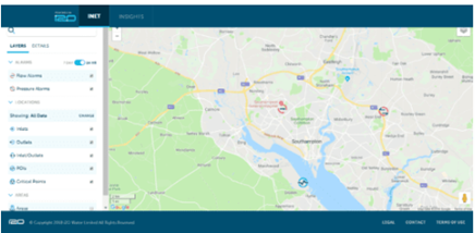 Uma rede de distribuição de água é melhor compreendida geograficamente. O Sentryx Intelligent Network (“iNet”) fornece uma poderosa interface do Google Maps, que coloca informações e percepções em um mapa, reunindo dados relevantes da rede para maximizar a informações em um único local. Ele oferece o mais amplo conjunto de funcionalidades analíticas e o método mais fácil de revisar, compartilhar e realizar insights, exibindo dados em forma de gráfico e em um formato tabular que permite ampla classificação e filtragem.